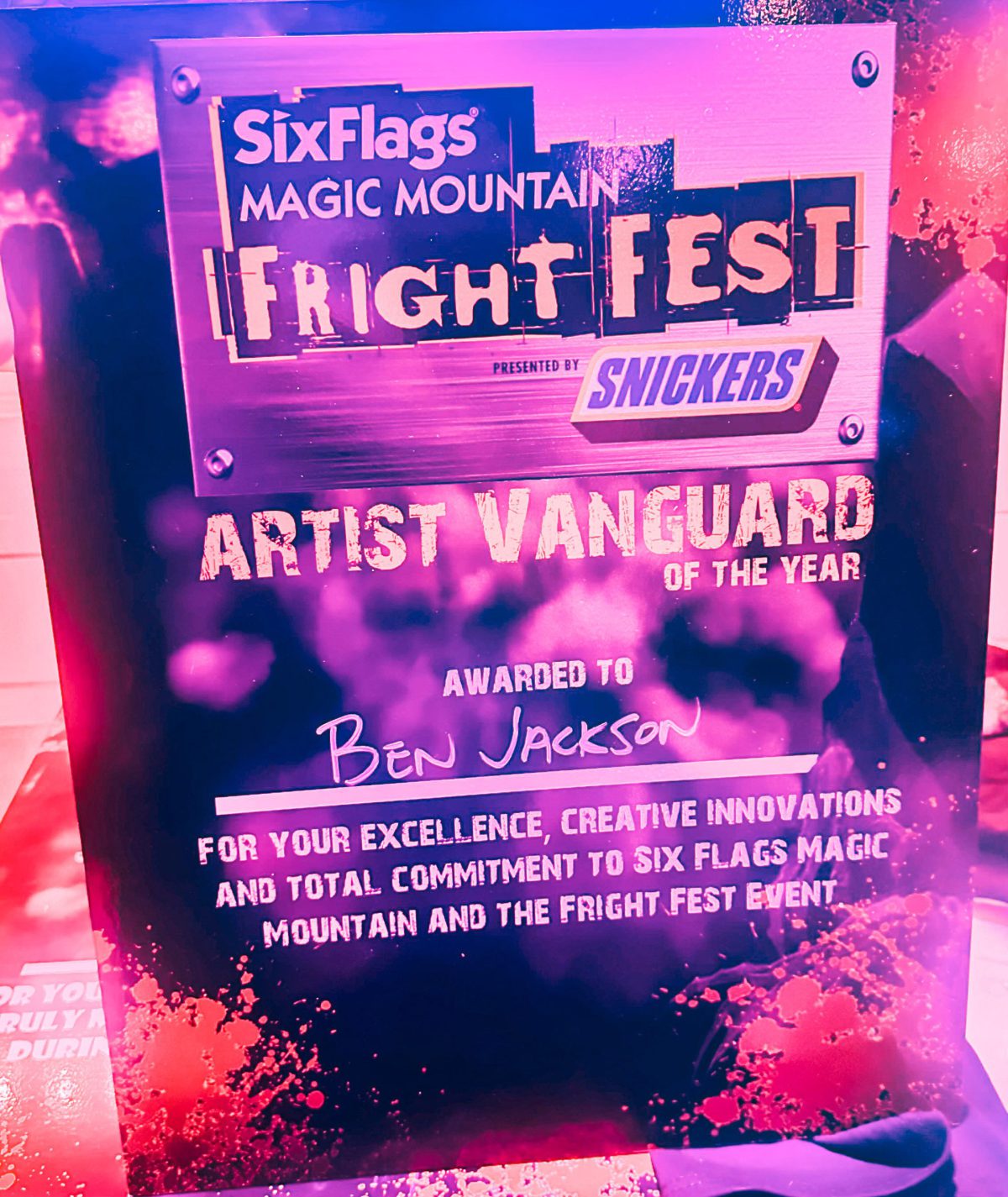 During Six Flags Fright Fest, Ben’s performance earned him the Artist Vanguard Audience Impact Award, celebrating his unique blend of character depth, improvisation, and audience connection. His work resonated strongly with guests and fellow performers, becoming a defining part of the season’s entertainment experience.